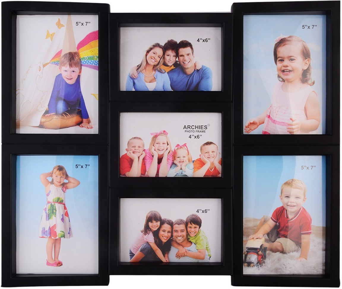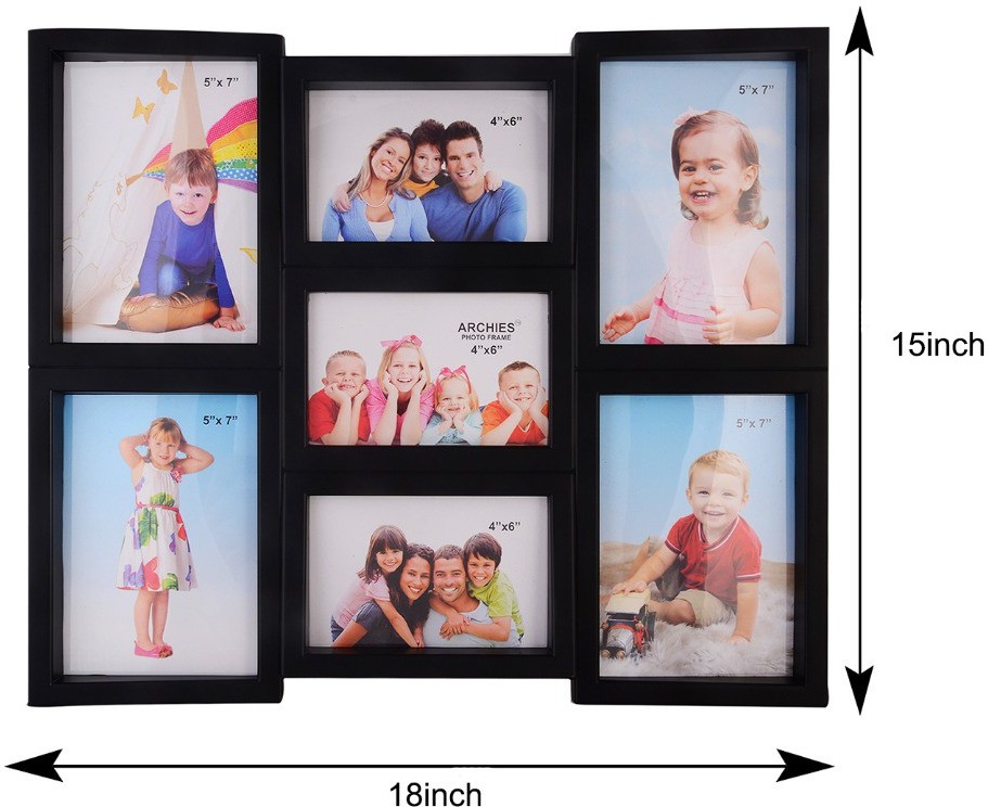 product specification keyStand Material, valuePlastic, keyFrame Material, valueAcrylic, keyBacking, valuePlastic, keyFinishing, valueGlossy, keyMaterial, valueGlass, keyNumber of Contents in Sales Package, valuePack of 1, keySales Package, value1 Photo Frame, keyShape, valueSquare, keycolor, valueBlack, keyNumber of Photos, value7, keyMounted, valueWall mounted, Table mounted Mounted, keyIdeal For, valueFamily, keyWeight, value500 g, keySuitable Photo Size, value15 x 10 cm, 12.70 x 17.78 cm, keyHeight, value15 inch, keyWidth, value18 inch, keyDepth, value2.54 cm, keyCare and Cleaning, valueWipe With a Wet Cotton Cloth
