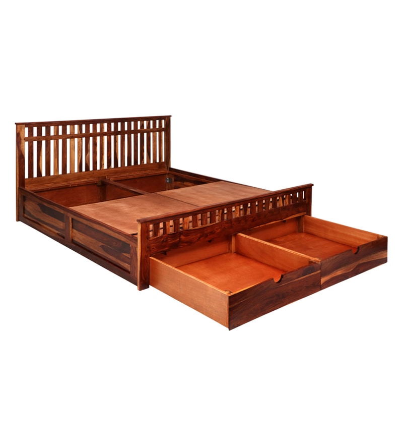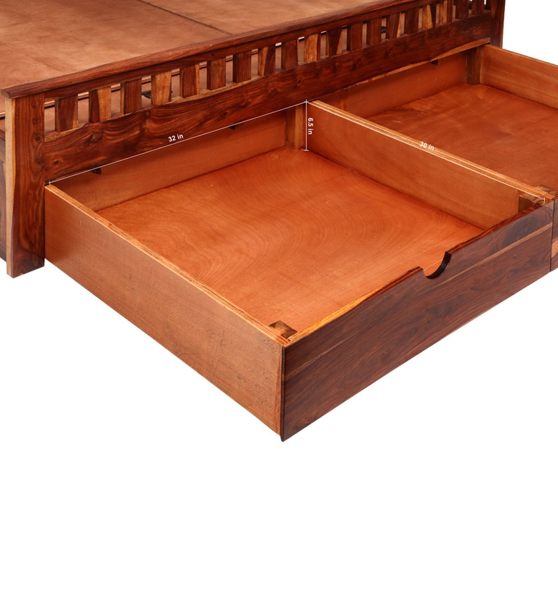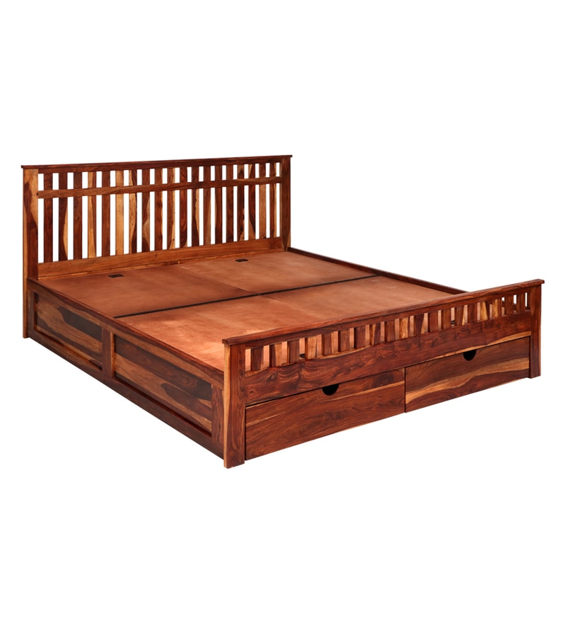 Specification GeneralMade Up Of Kiln Dried Chemically Treated Sheesham Solid Wood. Bed Head Board Is 40 mm Thick. Side Panels Are 27mm Thick . Headboard Has Very Elegant Design . Foot Baord Is 27 mm Thck. Height Of The Side Rails From The Floor Is 400 mm.Mattress Pannel Made Up With Ply Wood Which Is Very Sturdy & Durable. This Bed Has Pull Out Drawer .Available In Sizes : King & Queen.Recommended Mattress Size : 78X 60 For Queen & 78 X 72 For King Size BedDisclaimers:Accessories shown in the image are only for representation and are not part of the product.Depending on your screen settings and resolution on your device there may be a slight variance in fabric color and wood polish of the image and actual product.Wood grains will vary from product to product in case of solid wood furniture.Furniture having intricate hand-painted details are individual unique pieces and may have slight distinctions and variance between the picture and actual product.The Primary material is the main material used to manufacture the product and in addition to the primary material there might also be other type of materials used in the manufacturing of the product