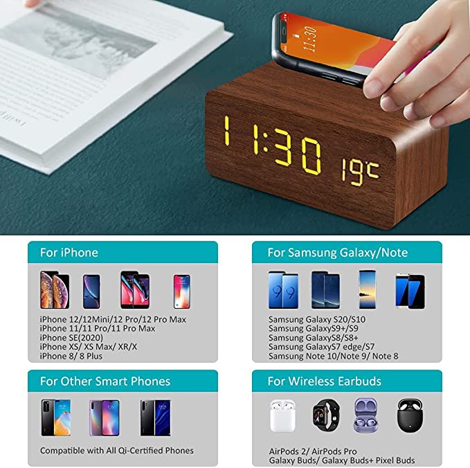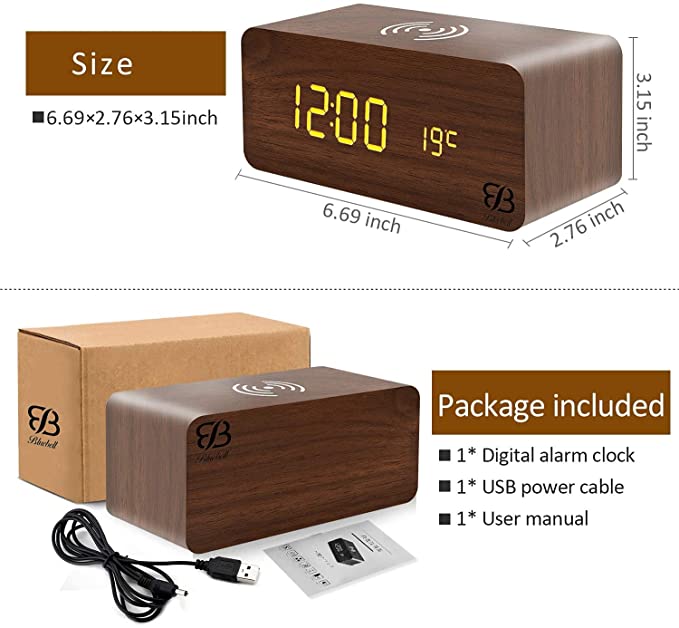 About this item【Wireless Charging With Alarm Clocks】 – Bluebell digital table clock Support QI Certified Wireless Charging cellphone models. It provides convenience for you to place and bedside table charge your phone at the same. It’s perfect for those who forget to charge their mobile.【Multiple Alarm Setting 】- This digital clock for Study table Updated in 2021 from dual alarms to three alarms clock for heavy sleepers, in this digital clock with light, set two or three alarms to better WAKE you up. One for you and the other for your families. Forever Say no to delay. Also, it allows you to set weekday mode, which will ring only on Monday to Friday.【Stylish Wooden Design for Decor】- This Smart digital clock with alarm must be the most delicate small clock you’ve ever seen. It’s not only a clock It’s also a good choice for a table clock for home decor, great decoration for your bedroom. Stylish appearance and multiple functions make it suitable as gifts for Your Wife, Husband, Kids.【3 Brightness Level Adjustable】- This led alarm clock Allows you to adjust from low to high brightness, or even turn off the LED light and keep it sound sensitive. It’s a user-friendly at-night clock for bedroom, which won’t be too harsh for your eyes. It’s a great alarm clock for boys.【Power Cord Operated】- This led digital clock with a wireless charger is operated by USB digital Clock to barrel power cord and battery-operated alarm clock. ***Batteries are NOT RECOMMENDED*** It drains batteries REALLY fast! Batteries are only for testing purposes or temporary use. Best Study table clock for Students.