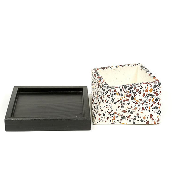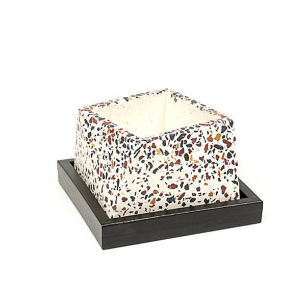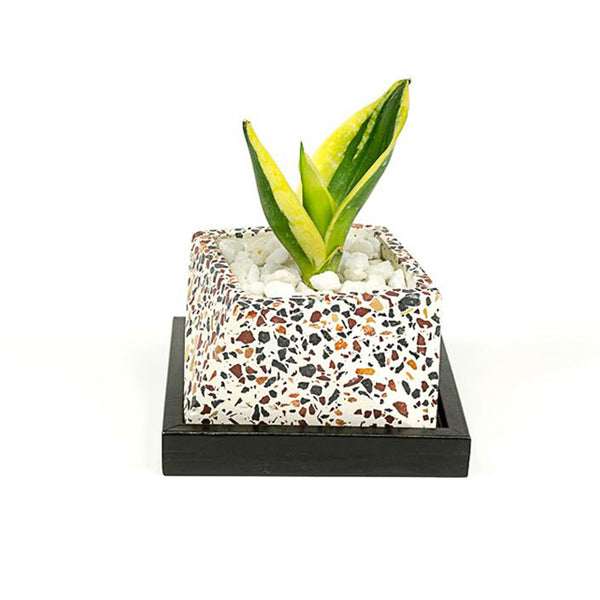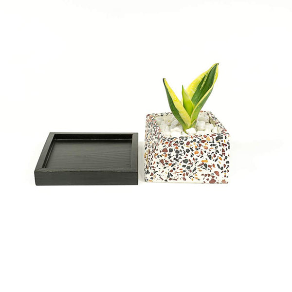 Description :Terrazzo the upcycled natural stone collection, adds new life to your home and make your room look amazing. The beautiful geometric shape, modern touch concrete planter looks great with succulents, house plants, indoor plants. The concrete planter is teamed up with black pine wood tray enhancing the complete look. Enjoy your lovable plants in this new and trendy plant pot. Green plants around you always reduce stress and increase joy in your life. Create a space you will love.Dimensions :L*W*H: 4*4*2.75Material :Concrete, natural stones, and pine woodCare & Instructions :Concrete is a fragile product, avoid jerk. Wipe dry with damp towel. This product is not food safe. Refrain from products used for direct consumption.