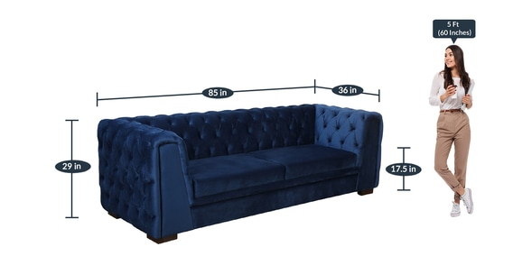 BrandCasaCraftDimensions(In Inches)H 29 x W 85 x D 36Weight60 KGColourBlueWarranty36 Months’ WarrantyAssemblyNo Assembly RequiredPrimary MaterialVelvet FabricRoom TypeLiving RoomSeating Height17.5Product Rating4.5Dimensions (In Centimeters)H 86.36 x W 215.9 x D 91.44