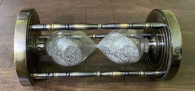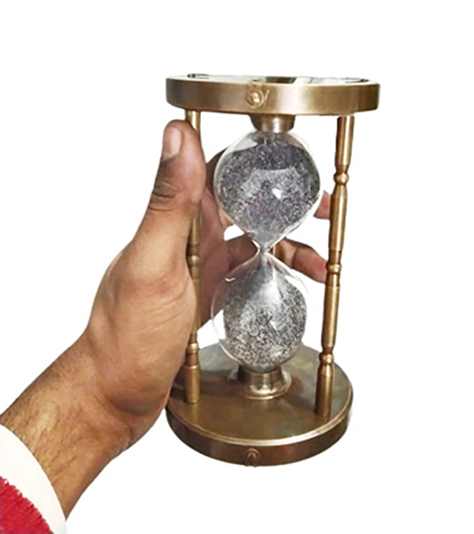 About this itemunique hourglass that is one a kind sand timer clock. Our handmade hourglass makes an exclusive nautical gift that sparks interest and appreciation. It also makes a unique home decor adding a slight vintage feel to any room. Sand timer is classic This table top item can give your office a decent table view. Brass and wooden made polished to shiny finish. Sand timer empty one side sand in approx 5 minutesMaterial : Brass, Glass & SandSize : 3.7 x 3.7 x 6 Inches, 9.4 x 9.4 x 15.2 cm ApproxFinish : Antique & Black SandAn hourglass has two connected vertical glass bulbs allowing a regulated trickle of material from the top to the bottom.Once the top bulb is empty , it can be inverted to begin timing again. we have already set the time on sand . It will run as per our description time limitUnique Gifting Item Family & Friendwe are provide best quality our customer