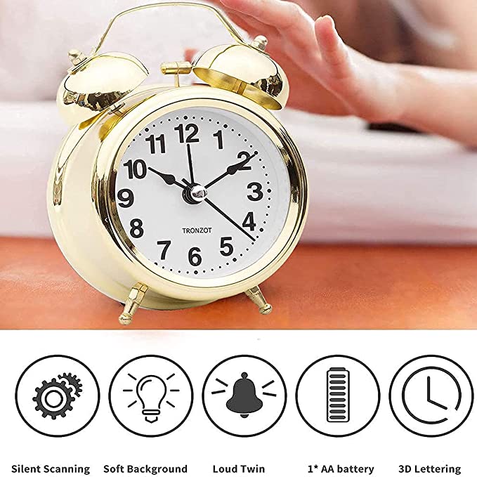 About this itemCOMPACT AND NON-TICKING DESIGN: This alarm clock has a compact size(6.5*2.2*4.7 inch), can be easily placed on the nightstand and desk, just need small space, great for study room, bedroom, living room, office and bathroom. Silent sweep seconds movement, ultra-quiet and simple design alarm clock, no annoying ticking sound, provide you with a quiet sleeping environment and a nice working and learning environment.RETRO STYLE: Beautiful vintage twin bell alarm clock, harmonious collocate with your desk and bedroom, retro style takes you back to 80’s.EXTRA LOUD ALARM SOUND: This alarm clock with twin bell, loud enough to wake you up, idea for heavy sleepers and hearing impaired. No snooze button and 5 minutes of constantly alarm noise, great alarm clock for people who have difficulty waking up. This loud alarm clock is a nice gift for your family and friends.EASY TO SET : Battery Operated. This alarm clock has four buttons: Two dials to set clock and alarm time, one alarm switch and one nightlight button. This alarm clock is very easy to set and use, suitable for most people.BUILT-IN BACKLIGHT: Easily press the night light button bhind the clock to have a soft yellowish light illuminate the clock face for a few seconds to see what time it is in the dark, convenience, energy-saving, and without hurting your eyes with the bright phone screen. This alarm clock also come with a large round face for easy reading during the day time, a great choice for daily life.