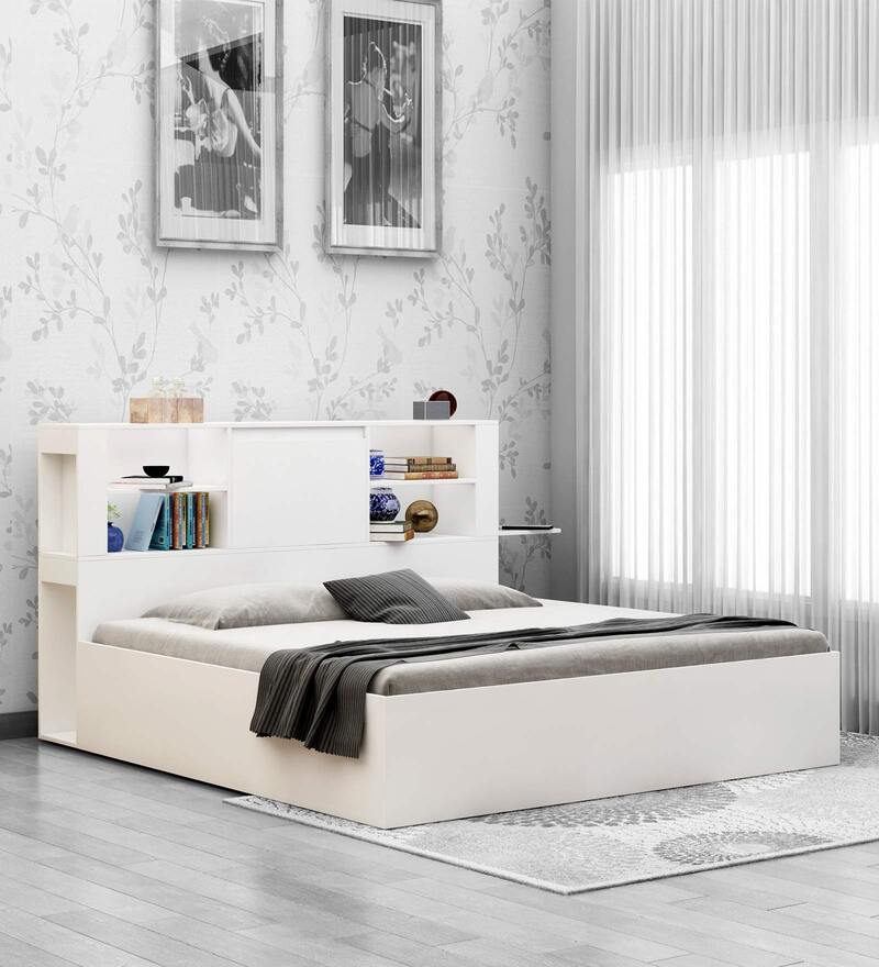Magnus Queen Size Bed with Box Storage & Charger in Mist White Color