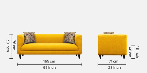 BrandFebonicDimensions(In Inches)H 30 x W 65 x D 28Weight60 KGColourYellowWarranty24 Months’ WarrantyAssemblyCarpenter AssemblyPrimary MaterialFabricRoom TypeLiving RoomSeating Height18Product Rating4.5Dimensions (In Centimeters)H 76.2 x W 165.1 x D 71.1Sofa FirmnessMedium