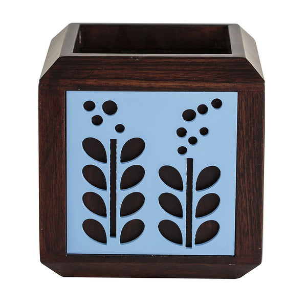 QUBO Serene Blue Flower Handmade Wooden Indoor Planter Pot