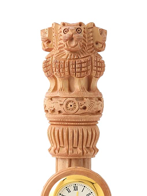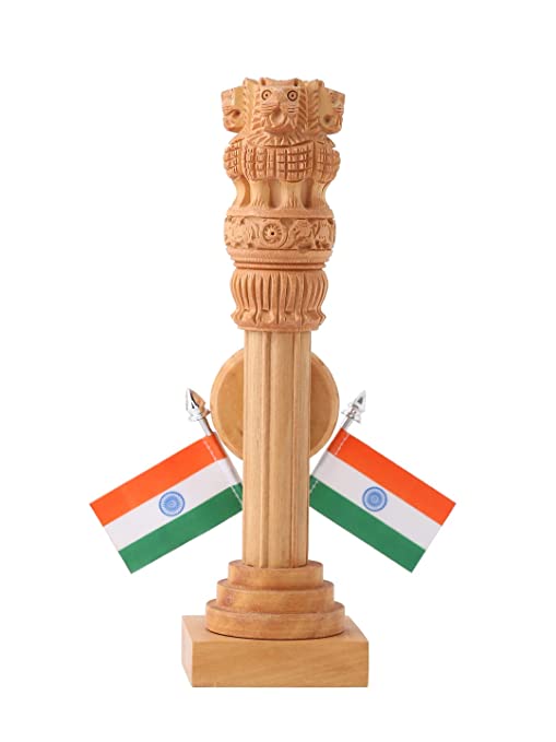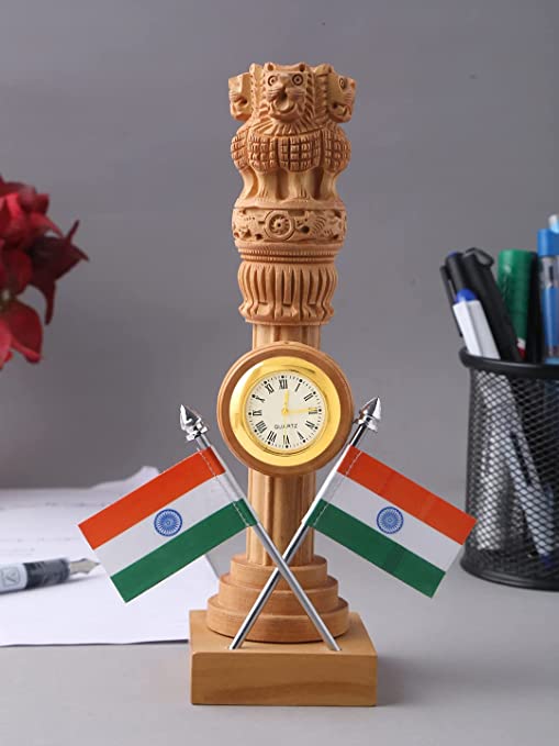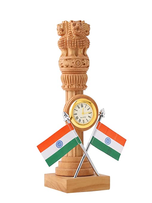 Material: Wood, Color: Brown, Perfect For Décor||Package Contains: 1 Pcs Wooden Carved Ashoka Stambh Pillar with 2 Flags & ClockAntique Wooden desk organizer having Ashoka stambh and flag also is an ideal for office table, study table, home decor.Height:- 21 cm; Width:- 6 cmAn Ideal Stationary Piece for Your Desktops, Study Table, Home Decorative and Also An Ideal Piece for GiftingDesigner Crafted strong but very light weight Product : Purely Handmade in Traditional ways by the Creative Artisans of India