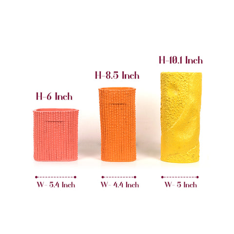 Category: Table DecorSub-Category: VaseDimension: Yellow (L10.1 inch, W-5 inch), Orange: (L8.5 inch, W4.4 inch), Salmon Pink (L6 inch, 5.4 inch)