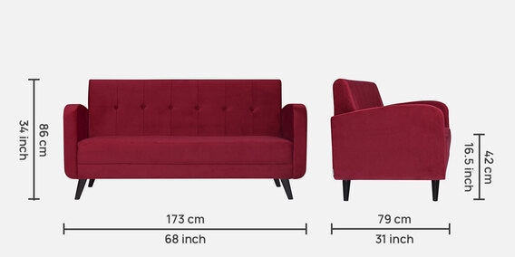 BrandARRADimensions(In Inches)H 34 x W 68 x D 31Weight41.8 KGColourMaroonWarranty36 Months’ WarrantyAssemblyCarpenter AssemblyPrimary MaterialVelvet FabricRoom TypeLiving RoomCollectionRomeSeating Height16.5Product Rating4.5Dimensions (In Centimeters)H 86.4 x W 172.7 x D 78.7