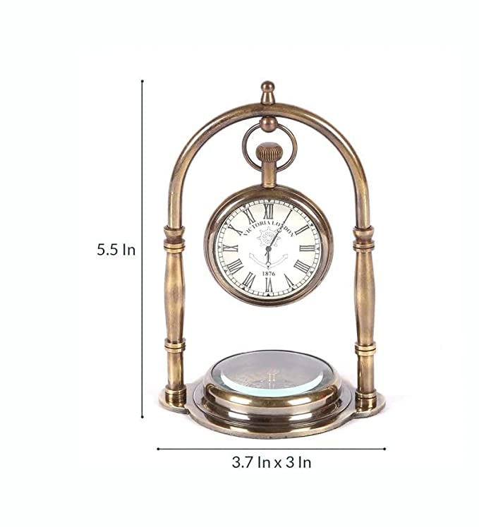 About this itemBrass Compass & Desk Clock is The Best Gift For Your Family And Friends.Material : Brass & Glass – Finish : AntiqueWeight : 300 Grams Approx, Size : 3.5 x 3 x 5.5 Inches, 8.9 x 7.6 x 14 cm ApproxThis Clock Use High Quality Movement & Work from Battery / CellVintage Style Table Décor, Home Décor, Office Décor -Fully Handcrafted Clock