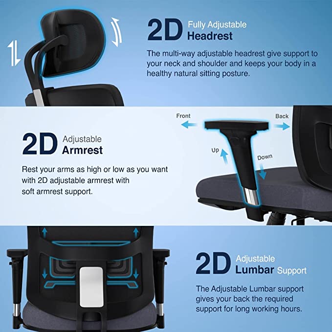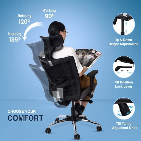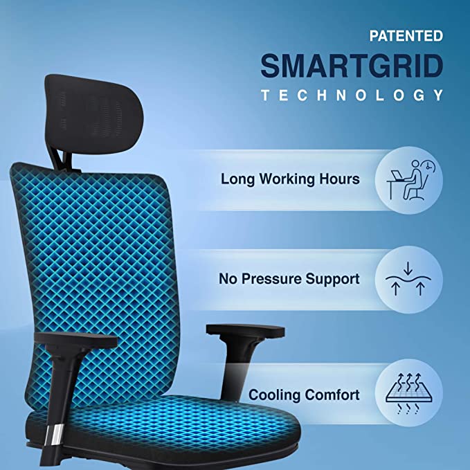 Colour Black & Grey ra The Sleep Compa roduct Dime io 48D x 62W x 117H Ce imeters tyle Moder pecial Feature Adjustable Lumbar, Adjustable Height, Arm Rest, Rolli , Head Support aterial Pate ed SmartGRID atter Black & Grey ecomme ed Uses For Product Office oom Type Office, Game Recreatio Room, Study Room rame Material lo ee less bout this item ate ed SmartGRID Tech logy – O x seat & back support are desig d with our Pate ed SmartGRID Tech logy which cradles your tailbo a provides extra cushio to your tushy for lo worki hours. Be it i a office or WFH setup SmartGRID Pressure Support allows your spi to stay i its tural posture a gives you a feeli of weightless ss. t just that it has multiple air cha els to e ure your seat & back stay cool a comfy. ultiple Adjustme s – 2D Adjustable Headrest |Heavy lo Chrome Fi shed 2D Adjustable Arms| The Ergo mically desig d S shaped backrest ca be tilted from 90 to 135degree with a 3 positio lock lever | 2D Adjustable Lumbar support ca be adjusted as per the back support required. eavy Duty Base Structure – Gas lift: Class 3 Samho sa Gas lift for seat height adjustme | Castors: Chrome Fi shed A i Scratch 60mm lo Wheels for 360 degree swivel moveme | Maximum Weight Load Capacity: 150kg | It is best suited for offices, meeti rooms, work from home setup, & livi room. arra y & Quality – Made i I ia | 3 Years Ma facturer’s Professio l a Hassle Free Warra y applicable from the date of delivery | ISTA Sta ard packagi for reduci i tra it damage | I tallatio by The Sleep Compa tech cia will be provided o selected pi odes. Co act us o +91 9811981911 o e your product is delivered