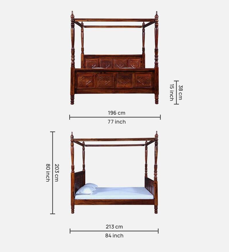 BrandMudramarkDimensions(In Inches)H 80 x W 77 x D 84; Seating Height-14.5; Mattress Size : 72 x 78(Not Included)Weight71.3 KGColourHoney OakWarranty36 Months’ WarrantyAssemblyCarpenter AssemblyPrimary MaterialSheesham WoodRoom TypeBedroomCollectionVayakaStorageNo StorageSeating Height15Recommended Mattress Size78 L x 72 W InchProduct Rating4.5Dimensions (In Centimeters)H 203.2 x W 195.58 x D 213.36
